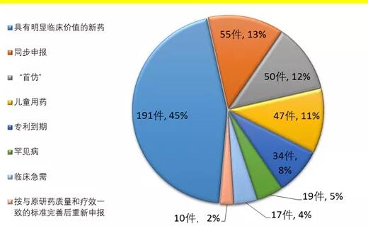 日前,CDE官网发布2017年度药品审评报告,从文中得知,截至2017年底,药审中心共将25批423件注册申请纳入优先审评程序,其中具有明显临床价值的新药占比最大,共191件,占45%,儿童用药共47件。纳入优先审评程序的注册申请情况详见下图。