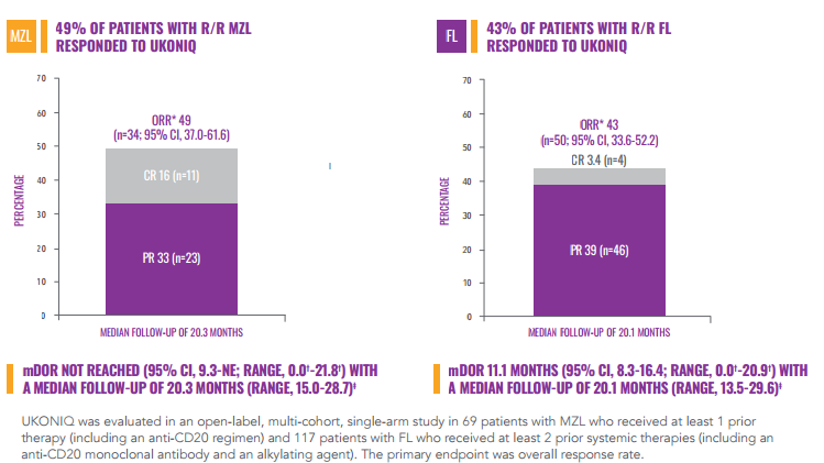 MZL和FL适应症的加速获批是基于一项开放标签,多中心,双队列II期UNITY-NHL研究总缓解率(ORR)数据。研究结果表明,MZL患者的总缓解率(ORR)为49% ,完全缓解率(CR)为16%,中位缓解持续时间(DOR)尚未达到。FL患者ORR为43%,CR为3.4%,DOR为11.1个月。