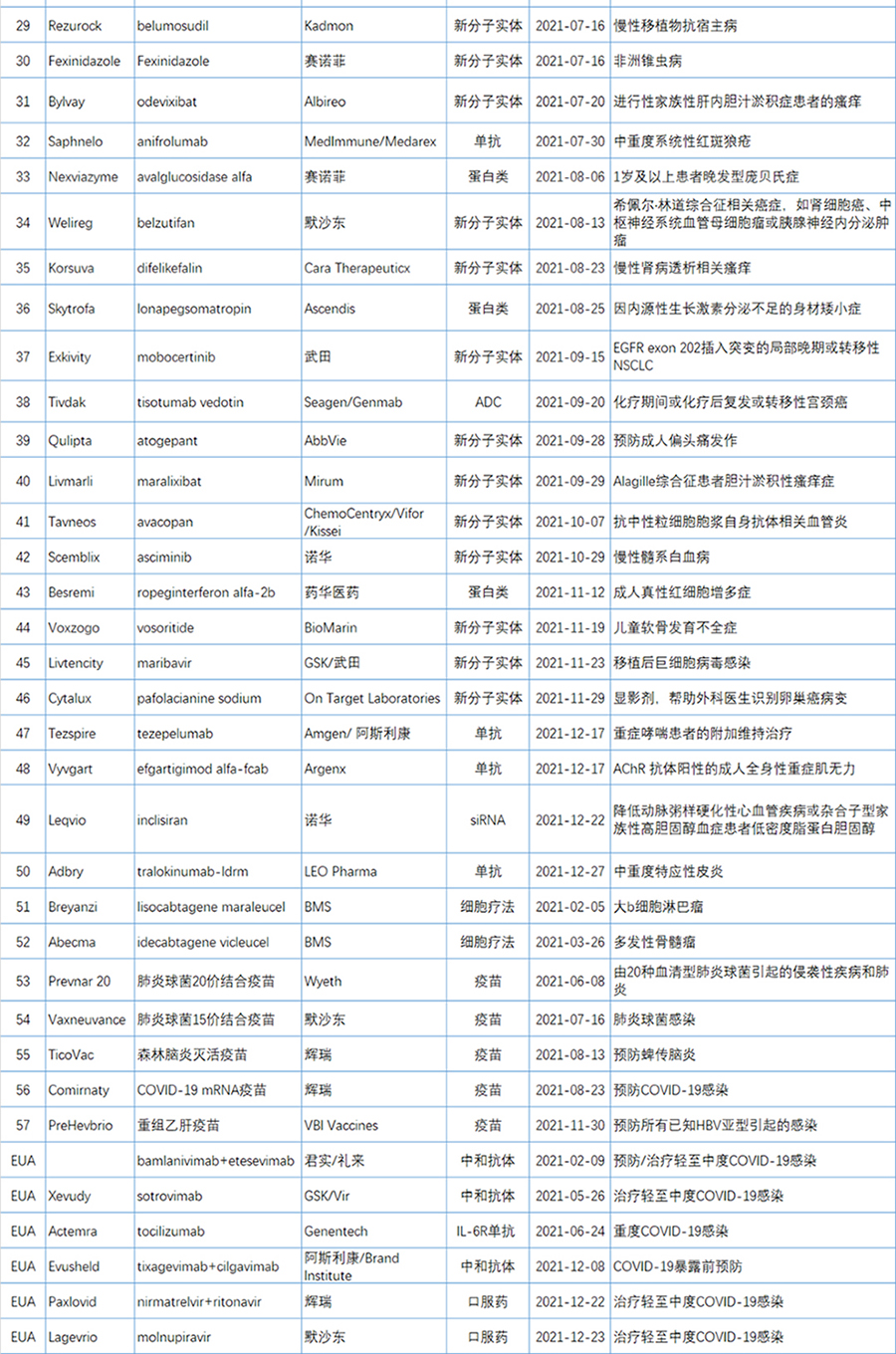 2021年FDA共批准50款新药(不包括细胞疗法和疫苗),包括36个新分子实体和14个新生物制品。
