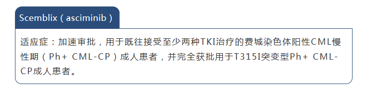 FDA此项批准是基于III期ASCEMBL试验和I期试验(NCT02081378)结果。ASCEMBL试验结果显示,治疗24周,asciminib vs 博舒替尼的MMR比率为25% vs 13%。因不良事件导致的停药率为7% vs 25%。